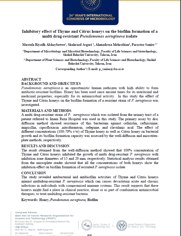 Inhibitory effect of Thyme and citrus honeys on the biofilm formation of a multi drug-resistant Pseudomonas aeruginosa isolate