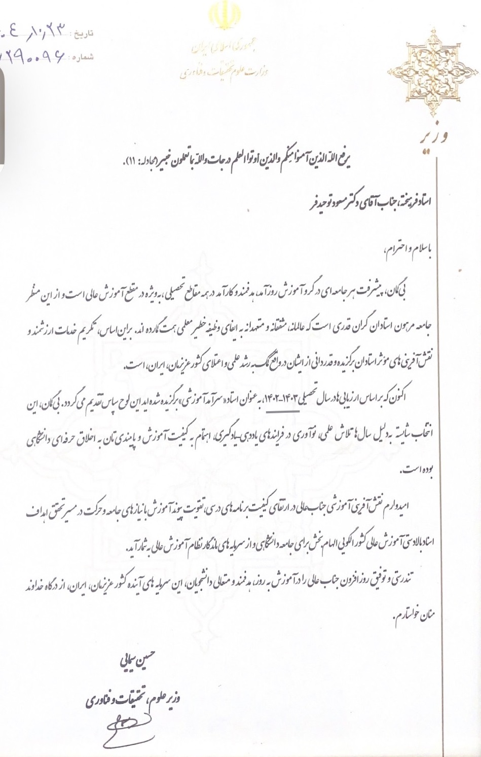 انتخاب آقای دکتر مسعود توحیدفر به عنوان استاد سرآمد آموزشی کشور