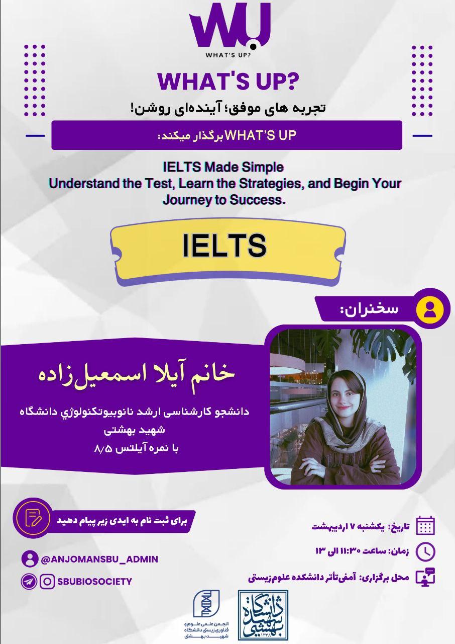 انجمن علوم و فناوری زیستی دانشگاه شهید بهشتی در راستای آشنایی دانشجویان با حوزههای مختلف علوم زیستی، بیوتکنولوژی و مسیرهای پیشرو، دهمین جلسه از سلسله نشستهای علمی «واتسآپ» را با محوریت آزمون بینالمللی IELTS برگزار میکند.