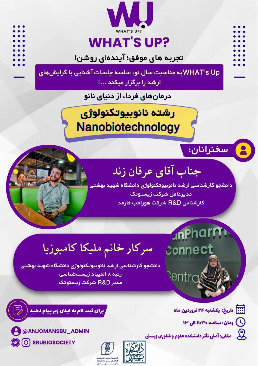 انجمن علمی دانشجویی علوم و فناوری زیستی دانشگاه شهید بهشتی، در ادامه سلسله جلسات «?What's Up» با هدف آشنایی دانشجویان با گرایش‌های مختلف مقطع کارشناسی‌ارشد، نهمین جلسه این مجموعه را با محوریت رشته نانوبیوتکنولوژی برگزار می‌کند.