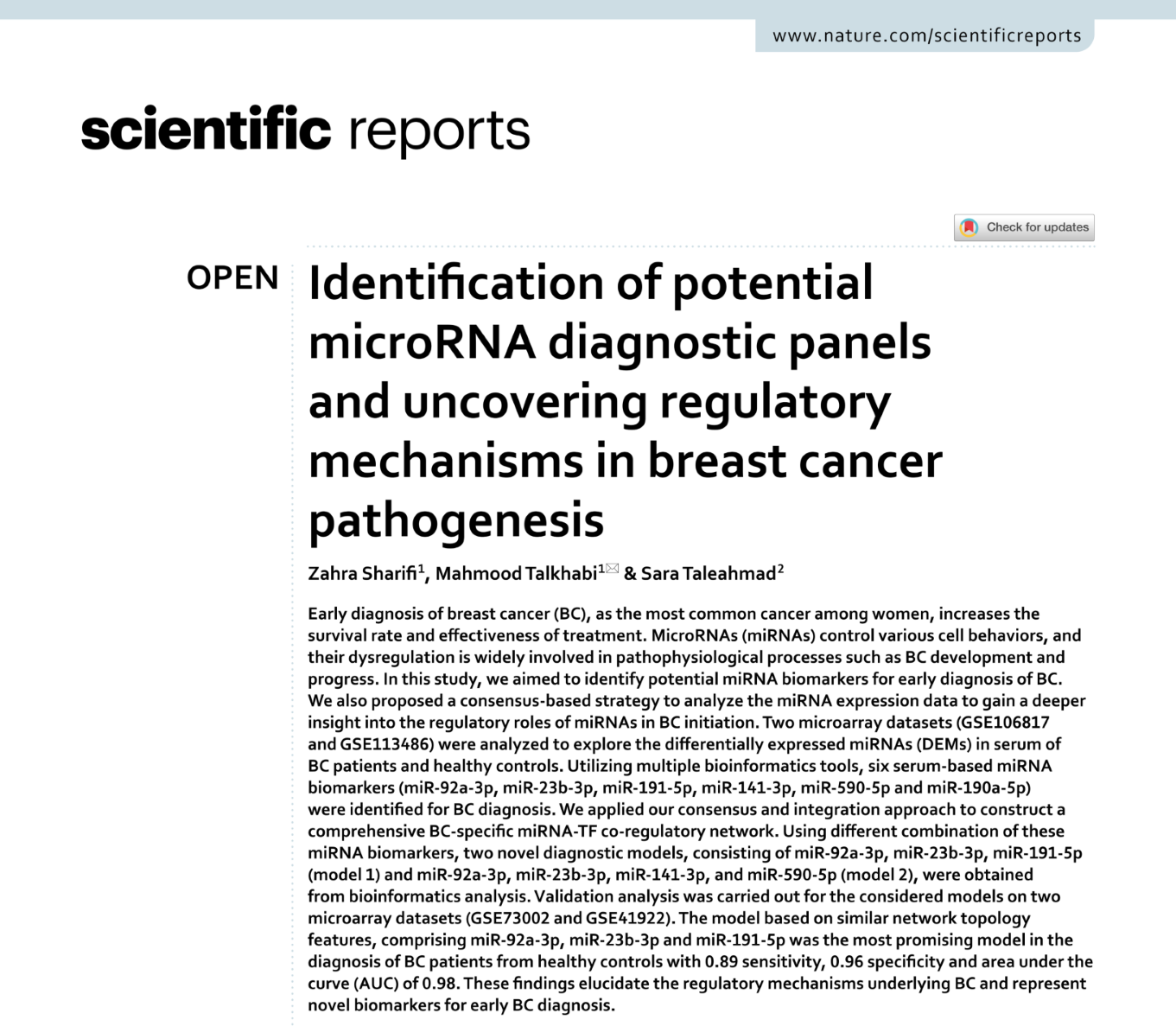محققان دانشگاه شهید بهشتی و پژوهشگاه رویان در تحقیقاتی مشترک موفق به شناسایی شش «میکرو «آر ان ای مناسب برای تشخیص زود هنگام سرطان پستان شدند. با هدف یافتن میکرو آرانایهای مناسب برای تشخیص زود هنگام سرطان پستان، دکتر محمود تلخابی، زهرا شریفی و دکتر سارا طالع احمد از دانشگاه شهید بهشتی و پژوهشگاه رویان جهاد دانشگاهی، در یک پژوهش، دادههای موجود در خصوص بیان میکرو آرانایها در سرم خون بیماران مبتلا به سرطان پستان و افراد سالم را مقایسه کردند. نتایج این پژوهش، وجود ۶ میکرو آرانای را که میتواند برای تشخیص زودهنگام سرطان پستان مورد استفاده قرار گیرد، نشان داد. با بررسیهای بیشتر دادهها، پژوهشگران این طرح، دو مدل جدید برای تشخیص زودهنگام سرطان پستان ارائه دادند: مدل اول ردیابی همزمان miR-92a-3p, miR-23b-3p, miR-191-5p و مدل دوم ردیابی همزمان miR-92a-3p, miR-23b-3p, miR-141-3p و miR-590-5p است. با بررسی و مقایسه دادههای بیشتر و شناخت سازوکارهای اصلی تنظیمکننده سرطان پستان، این پژوهش نشان داد که مدل اول با حساسیت ۰.۸۹ و ۰.۹۶ تشخیص اختصاصی، بهترین روش برای تشخیص زودهنگام سرطان پستان است.