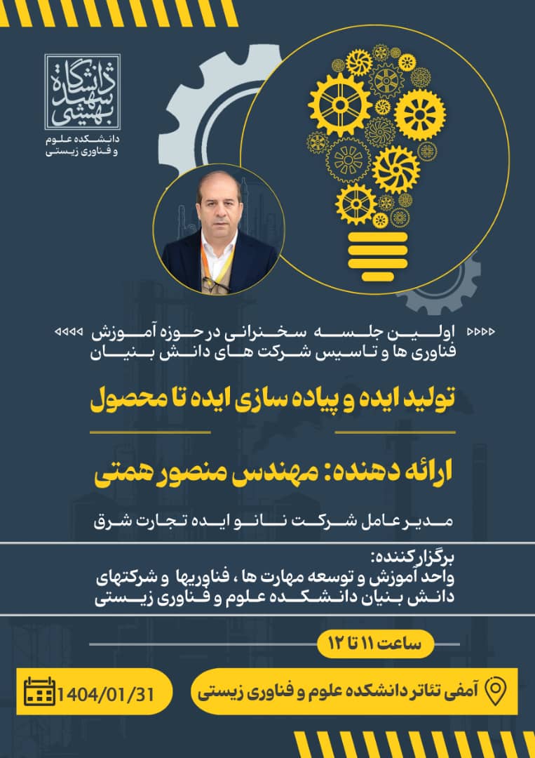 سلسله جلسات سخنرانی در خصوص تبادل تجارب و مهارتهای فناورانه صاحبان و مدیران عامل شرکتهای دانش بنیان در دانشکده علوم و فناوری زیستی به صورت هفتگی برگزار می شود واساتید این حوزه برای دانشجویان گرامی و اساتید محترم سخنرانی داشته باشند و با بیان تجارب و چگونگی کسب موفقیت ها و عبور از موانع و مشکلات بتوانند علاقمندان وارد حوزه کسب و کار شوند و از ذخایر دانش های اندوخته ثروت و سرمایه تولید کنند. در این راستا اولین برنامه یکشنبه ۳۱ فروردین ۱۴۰۴ در سالن آمفی تئاتر دانشکده راس ساعت ۱۱ تا ۱۲ برگزار میشود و از دانشجویان و اساتید محترم دعوت می شود با حضور موثر در این جلسات نیاز های دانشی، تجربی و مهارتی خود را در حوزه کسب و کار ارتقاء دهند