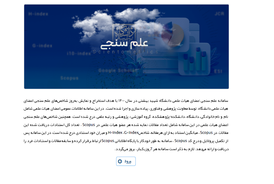 سامانه علم‌سنجی اعضای هیات‌علمی دانشگاه شهید بهشتی در سال ۱۴۰۰ با هدف استخراج و نمایش به‌روز شاخص‌های علم‌‌سنجی اعضای هیات‌علمی دانشگاه، توسط معاونت پژوهشی و فناوری، پیاده سازی و اجرا شد. این سامانه،  اولین گام در تحقق نظام جامع آمار پژوهشی در این دانشگاه است. به روز شدن و برخط شدن شاخص‌های علم‌ سنجی اعضای هیات علمی دانشگاه،  اقلام آمار پژوهشی و تهیه داشبوردهای مدیریتی پژوهشی،  تصویر روشنی از وضعیت پژوهشی دانشگاه را ترسیم خواهد کرد. در این سامانه اطلاعات عمومی اعضای هیات علمی شامل نام و نام خانوادگی، نام دانشکده/پژوهشکده، نام گروه آموزشی/ پژوهشی و رتبه علمی درج شده است.  همچنین شاخص‌های علم سنجی وداشبوردهای اطلاعاتی اعضای هیات علمی در این سامانه شامل تعداد مقالات نمایه شده هر عضو هیات علمی در Scopus ، تعداد کل استنادات دریافت شده این مقالات درScopus ، میانگین استناد به ازای هرمقاله، شاخص H-Index ،G-Index  و میزان خود استنادی درج شده است. در این سامانه پس از تکمیل پروفایل و درج کد Scopus ، سامانه به طور خودکار با پایگاه اطلاعاتی Scopus  ارتباط برقرار کرده و سابقه مقالات و استنادات فرد را دریافت و ارائه می‌دهد. لازم به ذکر است سامانه هر 7 روز یک‌بار،  بروز می‌گردد.