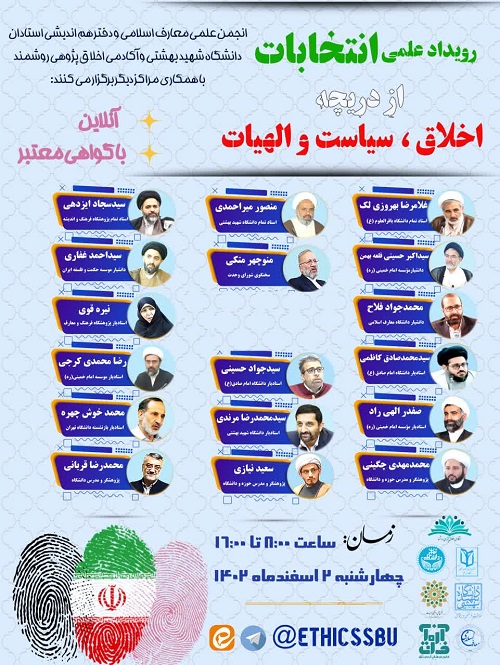 رویداد علمی انتخابات از دریچه اخلاق، سیاست و الهیات؛ چهارشنبه 2 اسفندماه 1402 در دانشگاه شهید بهشتی برگزار می‌شود.