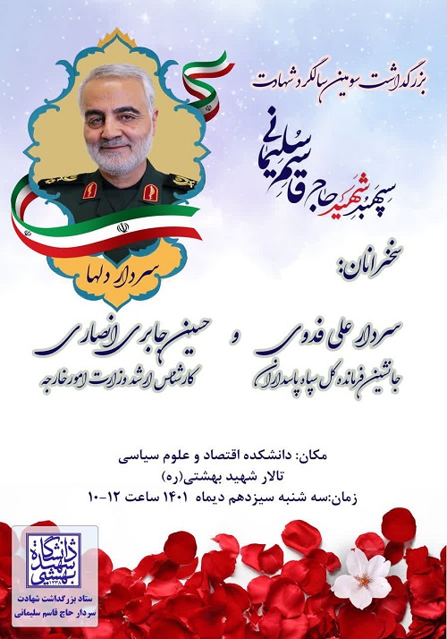 مراسم بزرگداشت سومین سالگرد شهادت سپهبد حاج قاسم سلیمانی برگزار می شود 2243 بازدید print share مراسم بزرگداشت سومین سالگرد شهادت سپهبد حاج قاسم سلیمانی؛ سه شنبه 13 دی ماه، 1401 برگزار میشود. این...